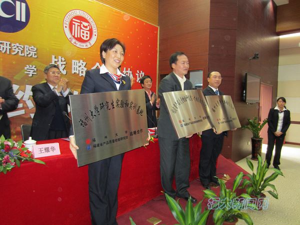 随后,福州大学与省质检院签订了科技战略合作协议、人才培养基地合作协议、共建科学仪器设备共享平台合作协议、首批科技项目(4项)合作协议。领导来宾向我校和省质检院颁发了“福州大学研究生实验和实训基地”、“福州大学预就业培养基地”和“福建省产品质量检验研究院人才培养教育基地”三块牌匾。