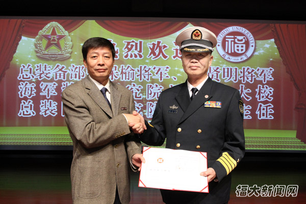 新闻中心讯/ 11月11日上午,受福州大学付贤智校长之邀,总装备部科技委顾问、原西昌卫星发射中心司令员唐贤明将军,海军装备研究院原副院长潘贵民大校访问福州大学,并受聘为福州大学客座教授。聘任仪式在福大图书馆博学厅隆重召开。福州大学校长付贤智、副校长王健和总装备部科技委顾问、福州大学客座教授曹保榆将军,总装防化研究院环境科学与工程研究室孟庆宝主任等领导出席大会。大会由王健副校长主持。