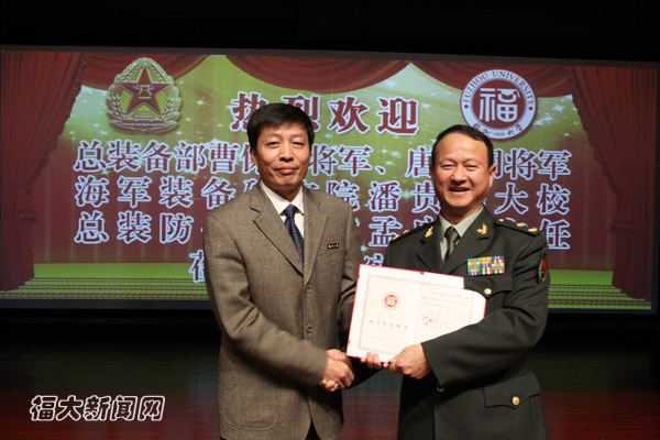 聘任仪式上,付贤智校长先后为唐贤明将军、潘贵民大校颁发福州大学聘书,佩戴福州大学校徽并合影留念。