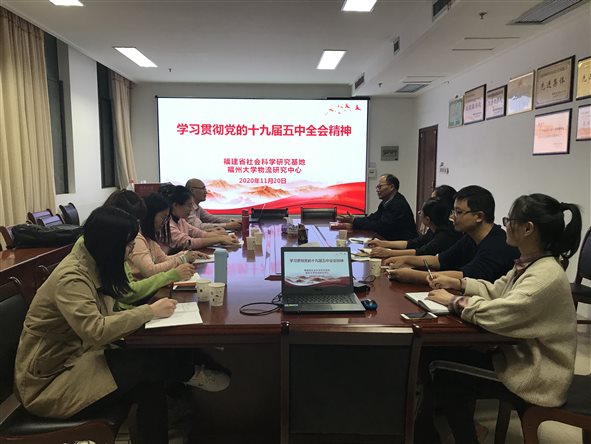 新闻中心讯/11月20日下午,福建省社会科学研究基地福州大学物流研究中心在福州大学旗山校区举办学习贯彻党的十九届五中全会精神研讨会。中心主任、首席专家王健教授主持会议,中心成员刘丹教授、赵永翔教授、阳成虎教授、刘碧玉副教授、梁红艳副教授、李梅芳副教授、张玲副教授,以及物流与供应链研究方向的4名博士研究生参加了研讨会。