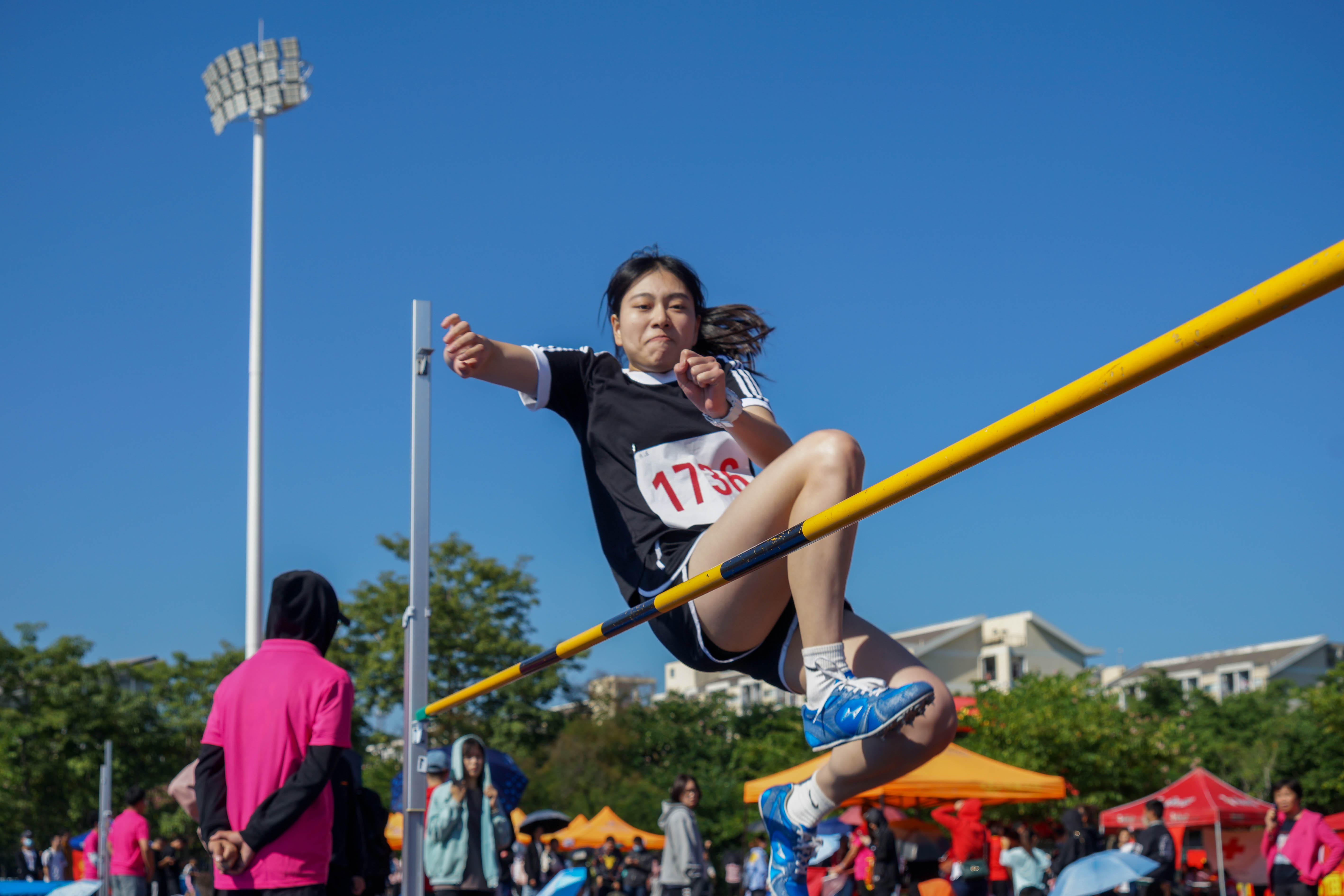 比赛开始后,7位运动员不分伯仲。但随着高度的不断升高,运动场上的气氛也逐渐焦灼起来。选手们或采用背越式,或用跨越式,用优美连贯的动作在空中划出一道道的弧线。