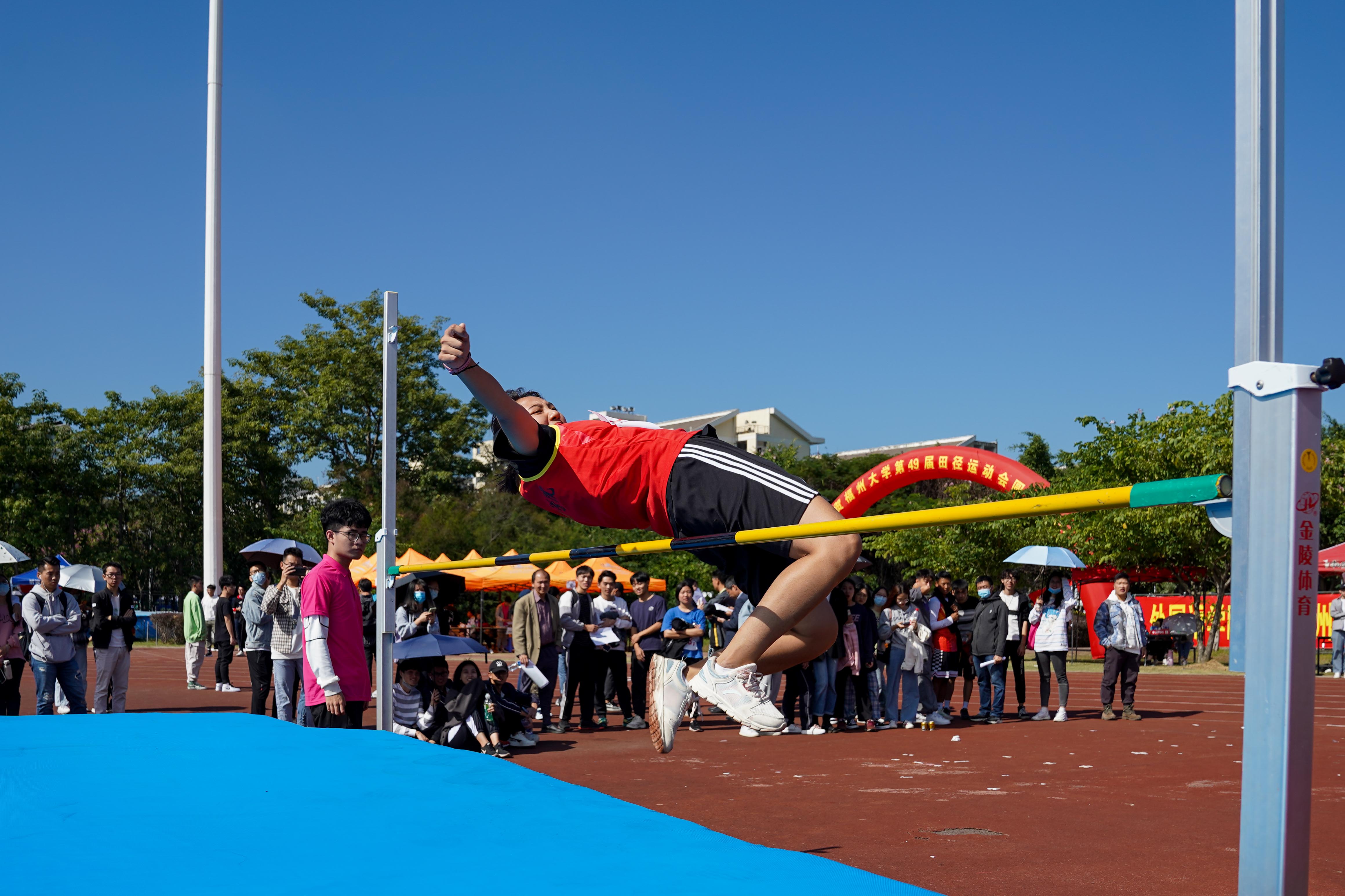 跳高运动不仅考验运动员的技巧,更对运动员的耐力与心理素质有着极高要求。随着横杆高度的逐步抬升,赛况愈加激烈。横杆升至1.33米时,只剩经管学院的石尚同学与机械学院的陆桂海同学进行较量。在连续两次未能突破1.39米后,石尚同学稍加休息,调整状态,随着令旗挥下,她挥动双臂,交替双腿,疾冲杆前,成功越过1.39米横杆。