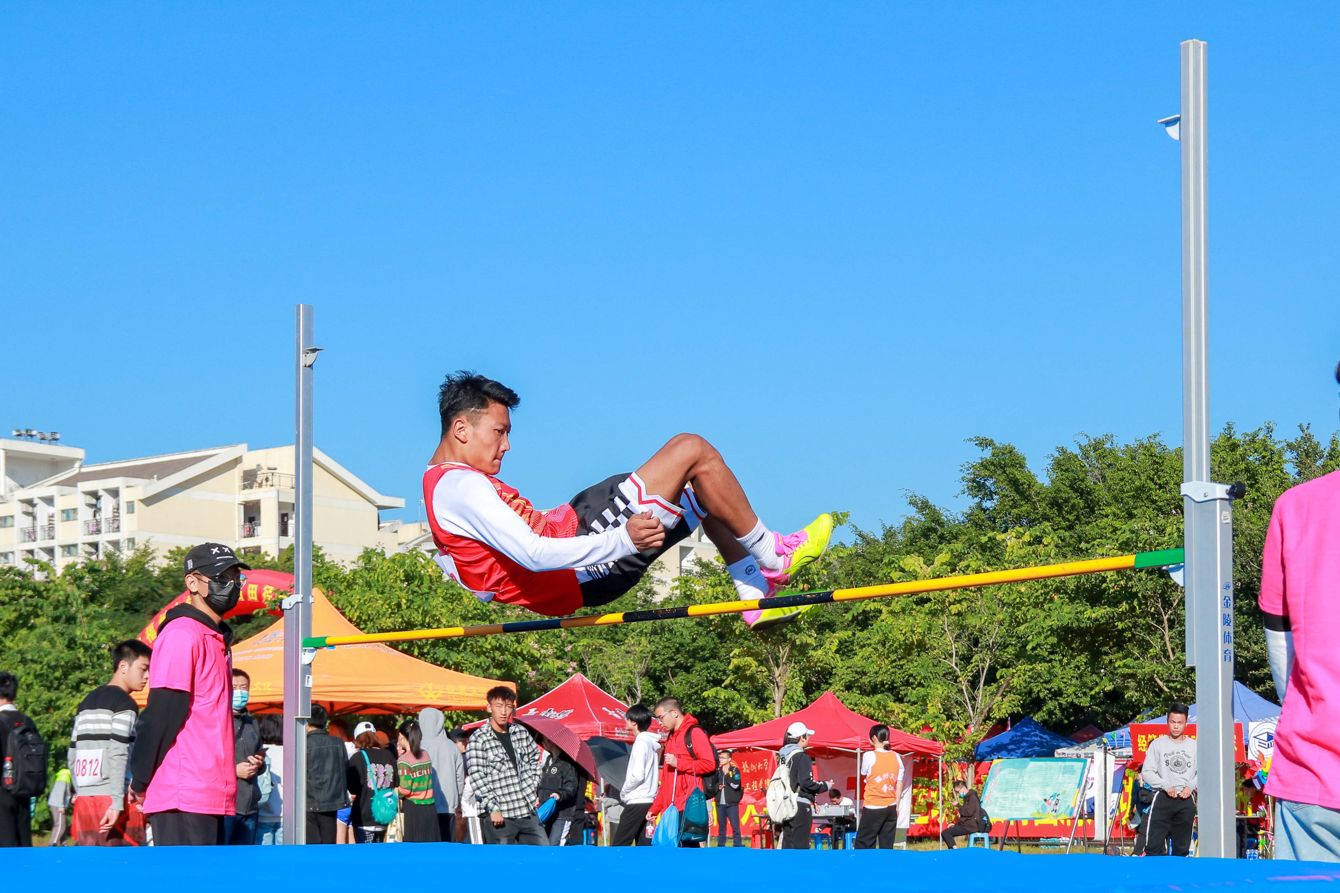 跳高是一项技术性极强的田赛项目之一,运动员们在不断征服高度的过程中挑战自我,超越极限。比赛进行得如火如荼,随着运动员们不断助跑、加速、蹬脚、起跳,现场氛围愈发紧张起来。当高度升至1.54米时,场上只剩下了三位同学进行比拼,其中两位来自生工学院的同学,而另一位来自机械学院。