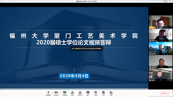 经过两周多的精心策划,2020届毕业研究生学位论文视频答辩于4月3日—5日如期举行并顺利完成。本次视频答辩学院邀请了来自省内外的8位专家担任答辩主席,共分8组26场进行,涉及毕业研究生51人,答辩委员和导师61人,答辩秘书及工作人员14人。师生们顺利完成了在云端的汇报、问答、评分、会议讨论、扫码投票等程序。这一不同寻常的答辩模式,将成为厦门工艺美术学院研究生教育的特别记载,也将成为导师和研究生们的共同记忆。