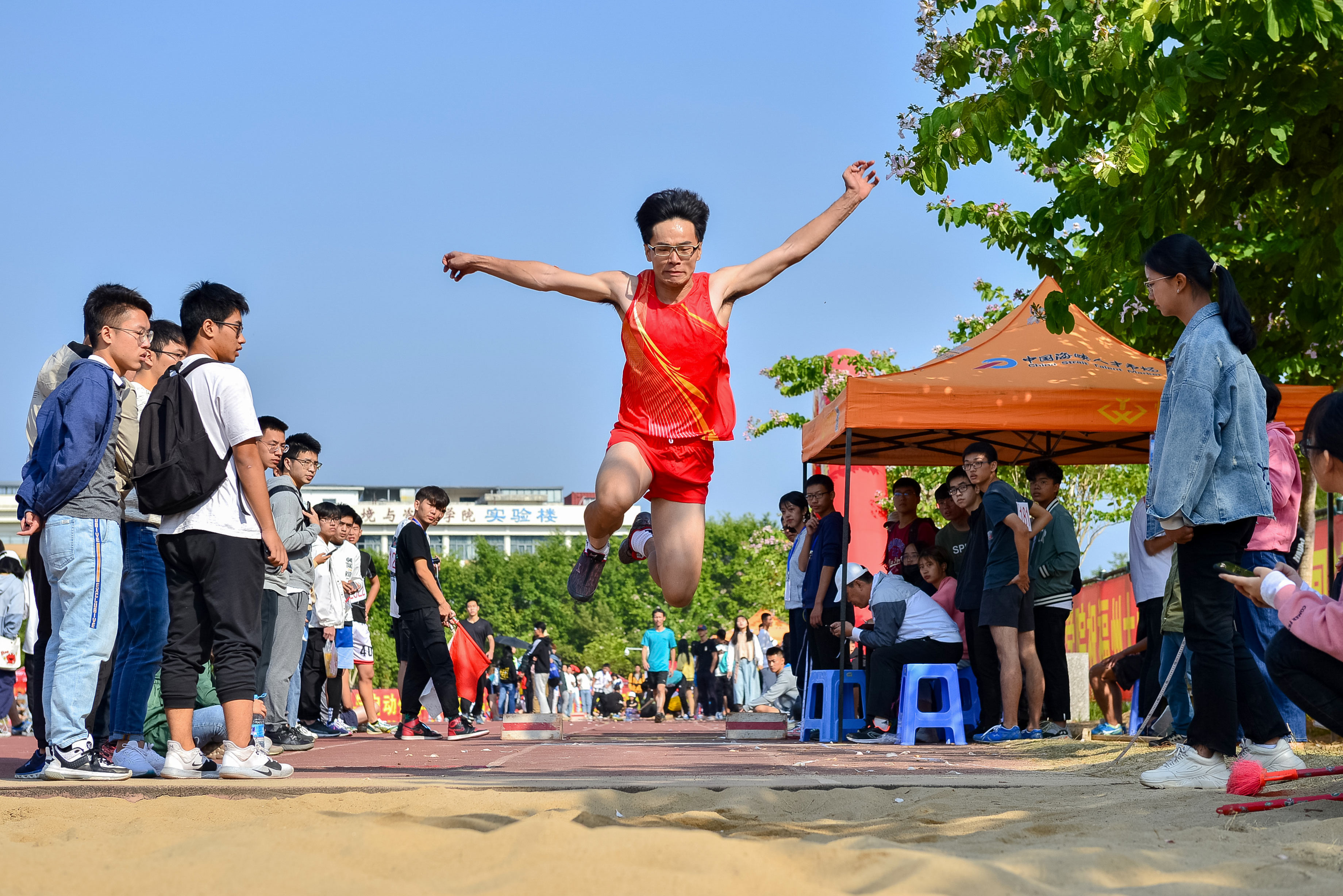 三级跳远是一项技巧与力量并重的运动,选手们在比赛过程中展现出了运动的艺术。其中来自紫金学院的李靖同学表现尤为突出,他坚定的目光望向前方,随着助跑起跳,他宛如飞人一般跃向空中,落入沙坑尘土飞扬,引起周围观众一阵阵惊呼,并最终以优异的成绩获得了男学乙三级跳远项目的冠军。