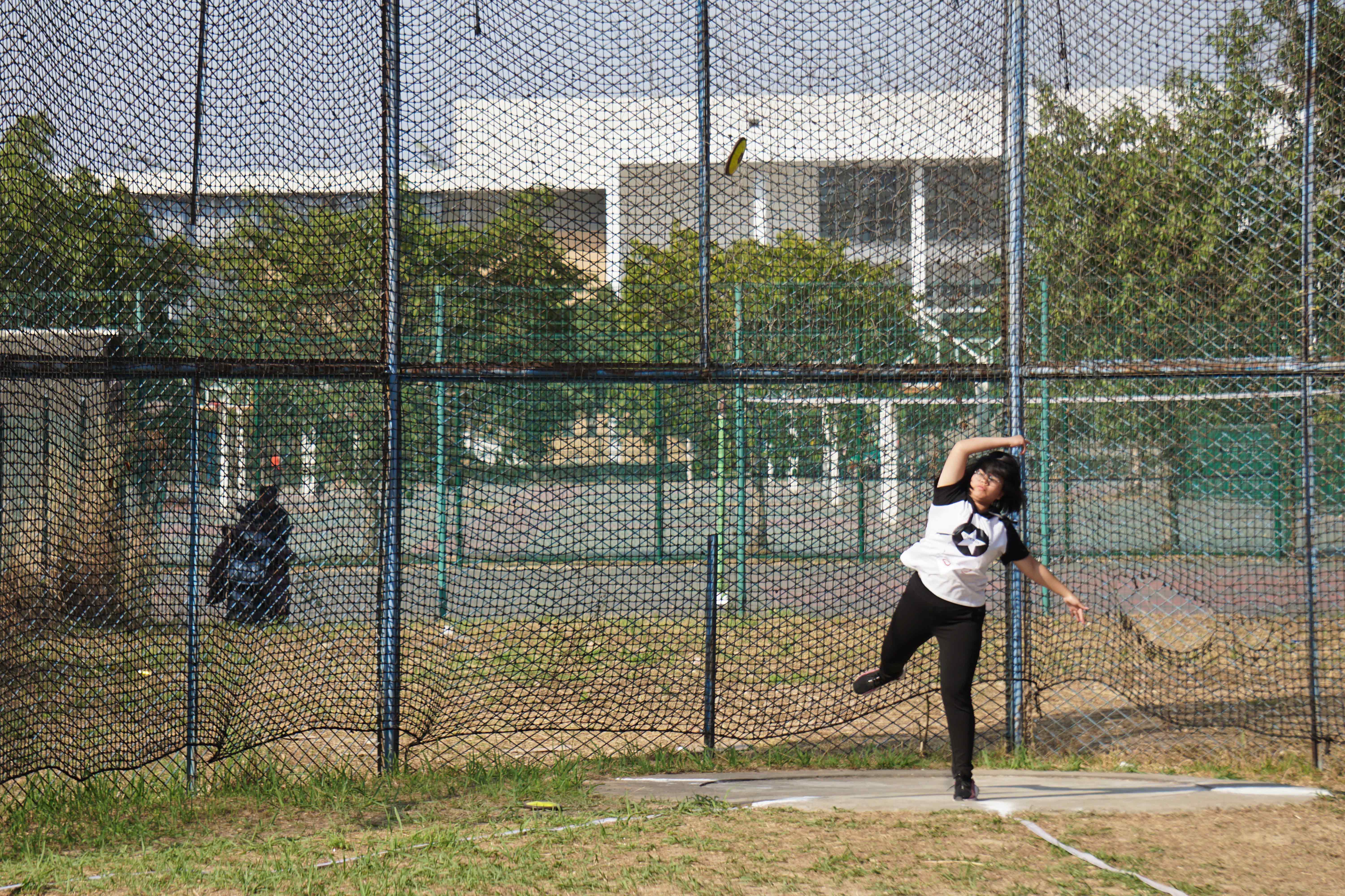 紧接着,前8名的同学进入决赛,角逐冠军。选手们不再保留,发挥全力,其中,来自电气学院的刘淑燕的表现最为亮眼。只见她原地站立,五指自然分开握住铁饼,短暂的目视前方后,她双脚分开、背对目标,在几次身体前后预摆后,她的重心开始左移,接着,右脚蹬地,她以左脚为轴,手臂带动全身快速转动,手中的铁饼在空中旋转着划出一段弧线后落地。