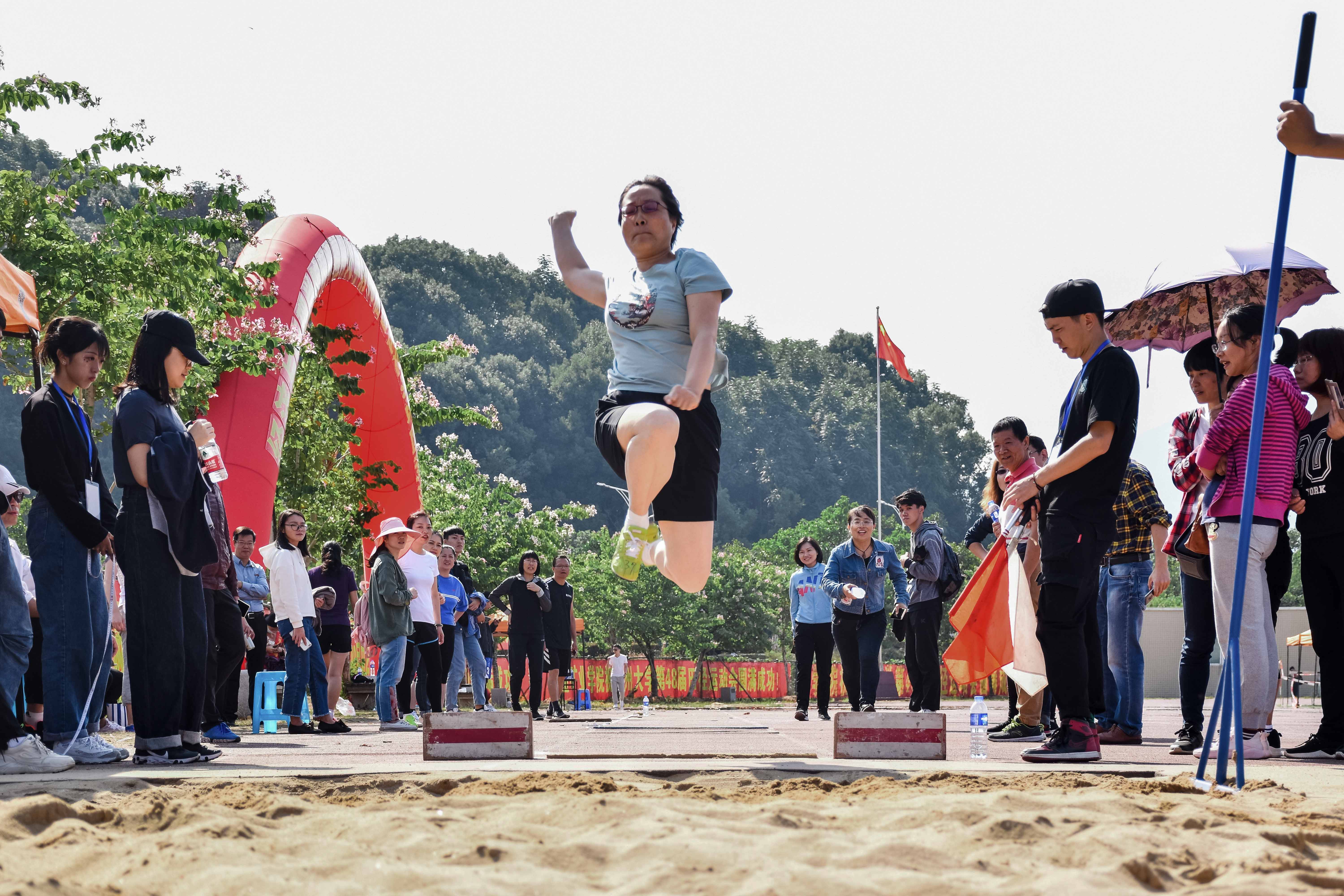 赛前,运动员进行热身和试跳。他们目光坚定,从助跑,起跳,腾空到落地一气呵成,干脆利落。比赛开始,来自电气学院的李玉榕老师在第一跳就获得惊人的成绩,引得场边观众阵阵掌声。运动员们都不曾松懈,全力以赴,为取得最佳成绩而努力。