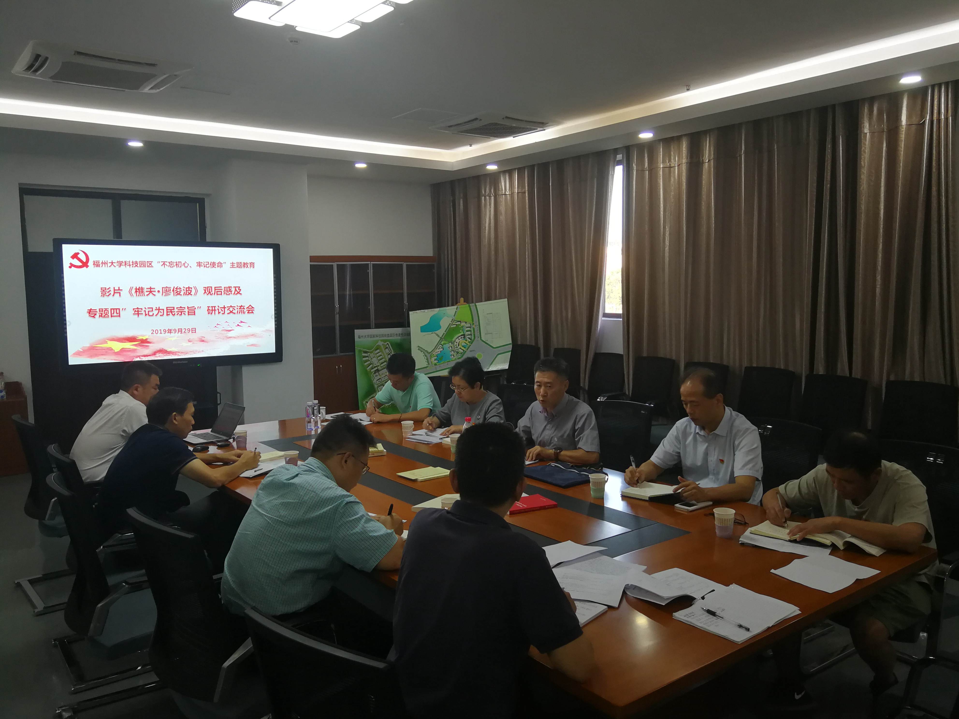 新闻中心讯/9月29日下午,福州大学科技园区党委组织党委班子成员和处级党员干部观看完主旋律电影《樵夫·廖俊波》后,在国家大学科技园阳光楼二楼201会议室召开“不忘初心、牢记使命”主题教育专题四“牢记为民宗旨”的集中学习研讨会。会议由科技园区党委书记柯瑞英主持。