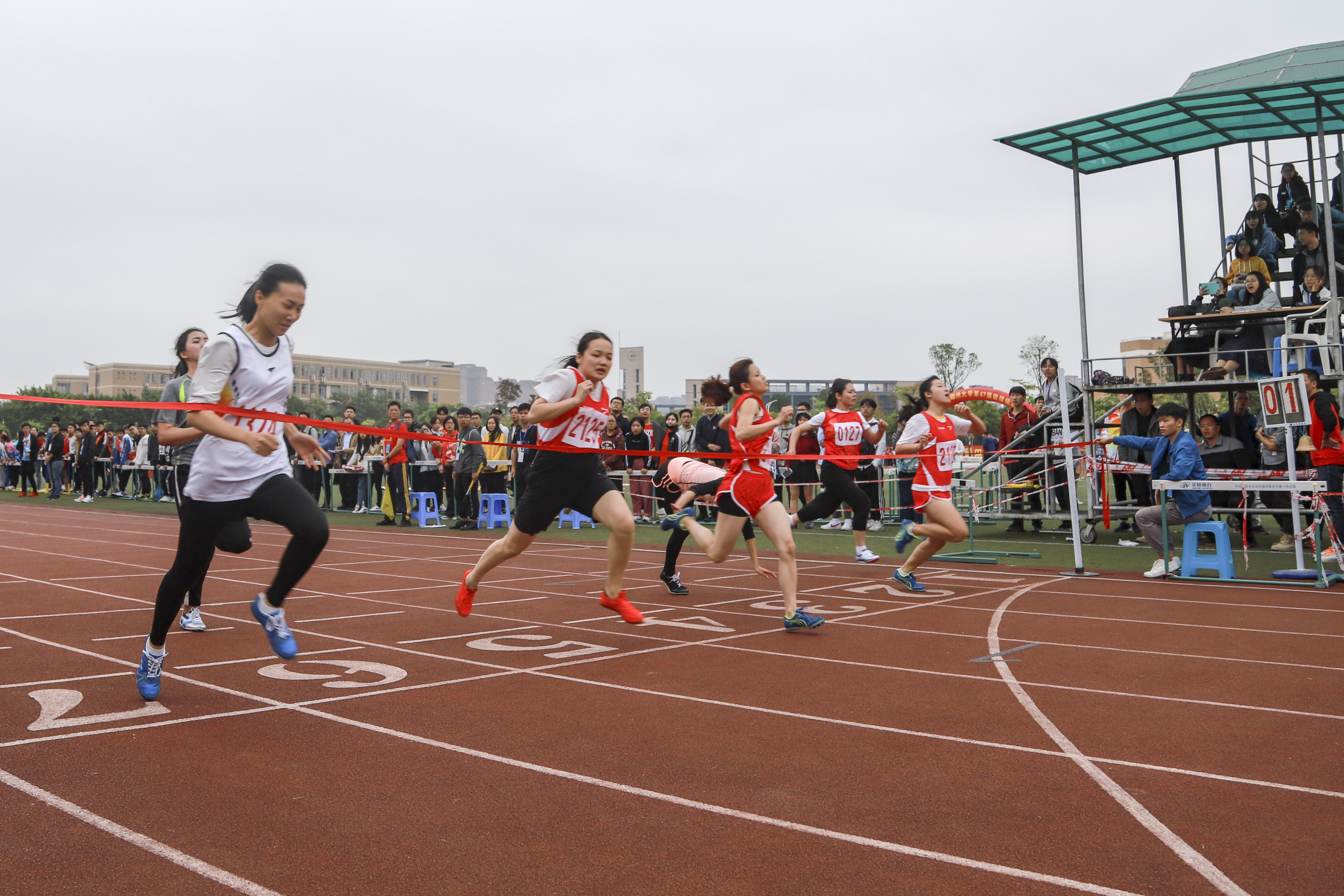 在起点,每位运动员都已是整装待发,只等候发令指示的下达。比赛刚刚开始,场下的观众就开始为参赛选手们加油呐喊。运动员们也似乎是受到了鼓舞一样,奋力向前奔跑。只见来自数计学院的钟璐英选手一马当先,在一开始时就成为了队伍里的“领头羊”。而落后她一步的是同样来自数计学院的陈姣伶选手和林雅静选手。短短的一百米,竞争却是十分激烈。十几秒的赛时,是紧张的,也是刺激的,也耗尽了所有参赛选手的力气。当所有参赛选手跃过终点时,这场比赛已经落下帷幕。