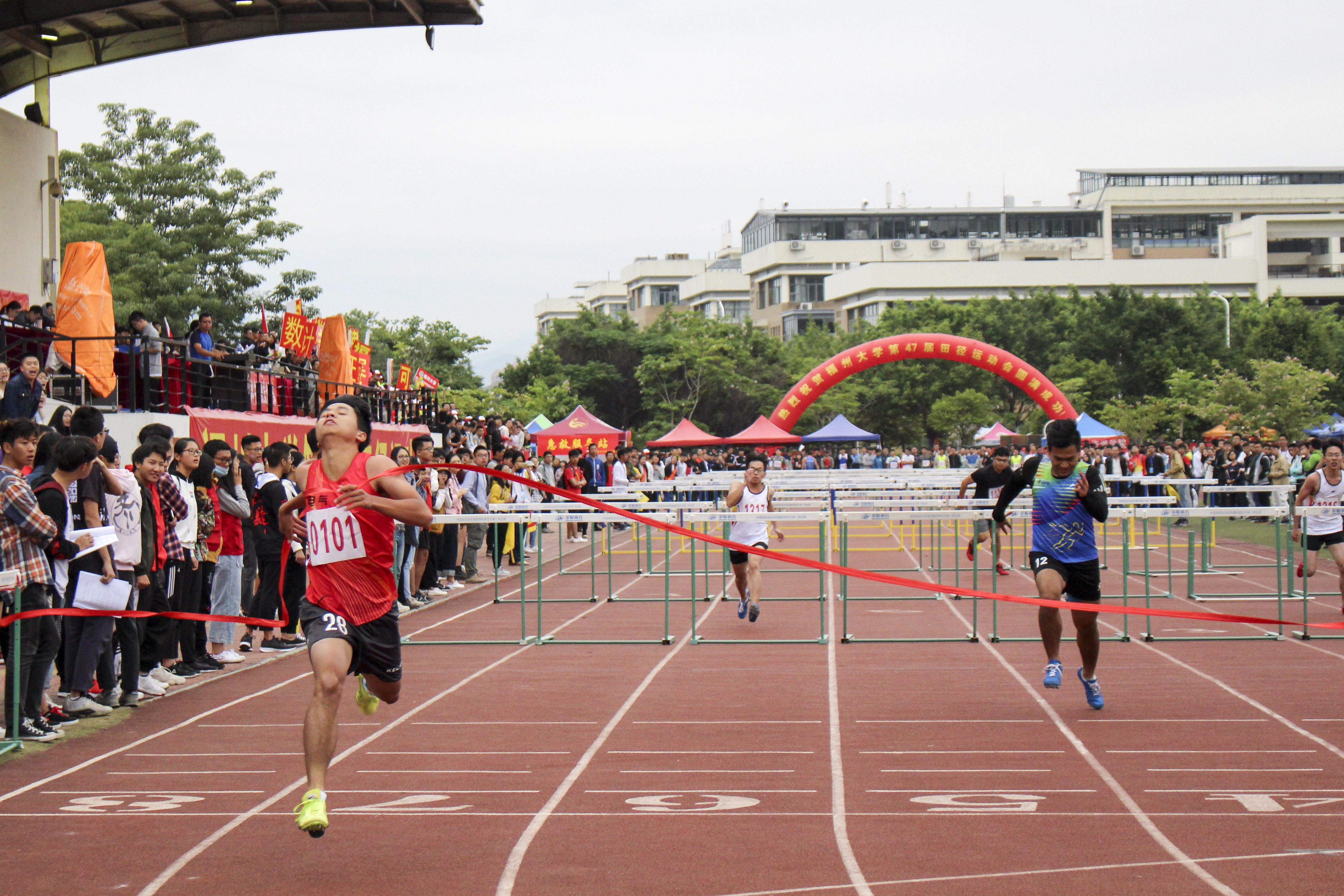 随着枪声响起,选手们像离弦之箭般冲向前方,没有一丝犹豫,以必胜的信念大步向前,跨过跑道上的一道道栏。在啦啦队此起彼伏的加油声中,选手们逐渐拉开了彼此间的距离,来自经管学院的林剑鸿凭着稳定的发挥,始终跑在第一的位置。