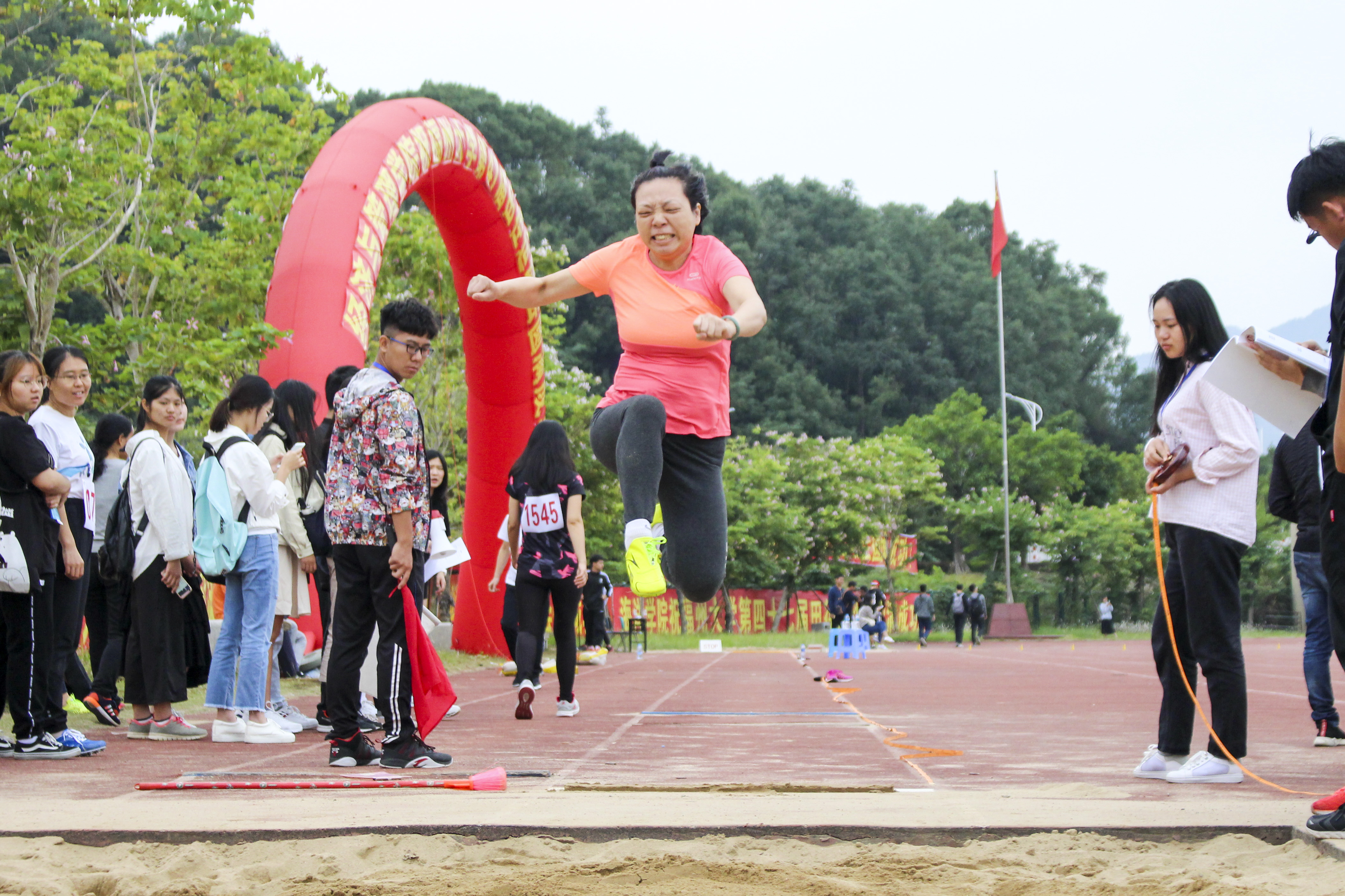 比赛前,老师们的氛围相较于学生比赛显得轻松许多,大家相互交流着以往所得的经验,给彼此加油鼓气。随着裁判员命令声起,比赛开始,气氛一下子变得紧张起来。老师们紧盯远处的沙坑,助跑、跳跃,在空中划过一道优美的弧线,随后落入沙坑。来自机关联队的陈淑媛老师表现优异,引起了场外声声惊叹。