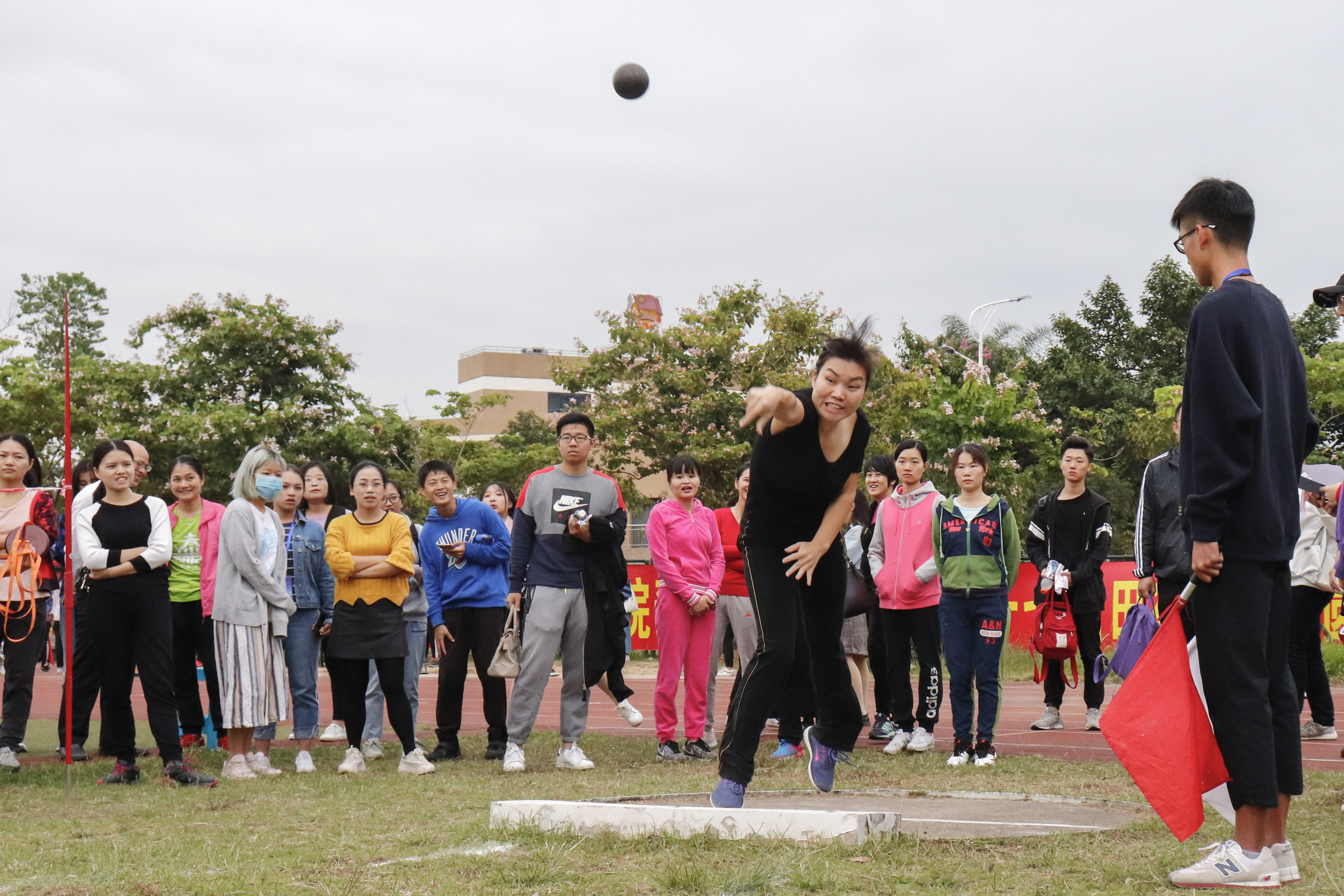 11月9日上午9时,女教青铅球比赛在一区田径场东南区举行,来自包括校直联队在内的11个学院,共计16人参加此次比赛。