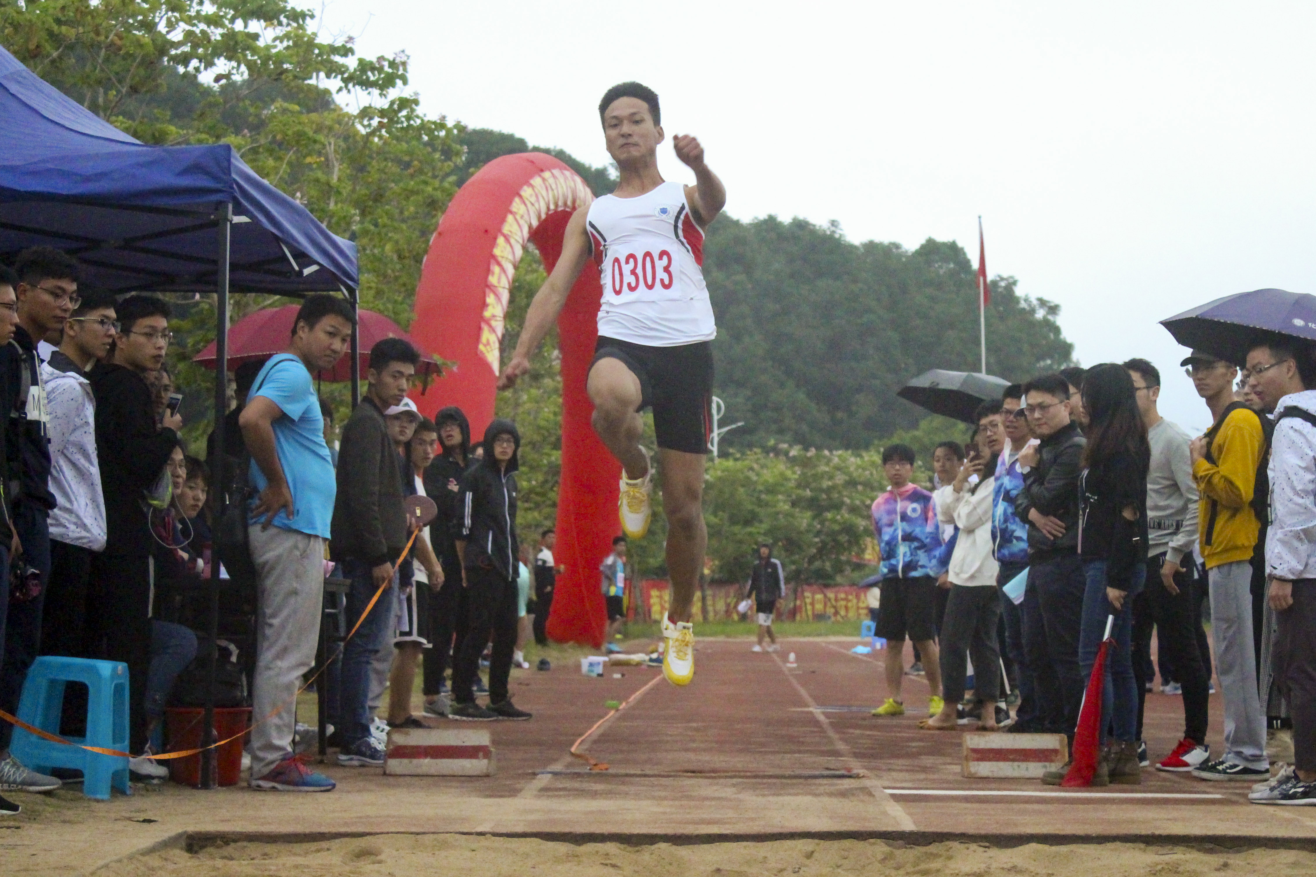 11月9号下午15点整,阴沉沉的天空也阻挡不住运动员们心中澎湃的激情。赛前热身阶段,运动员在沙坑边上用自己的步长丈量助跑距离,依次试跳。