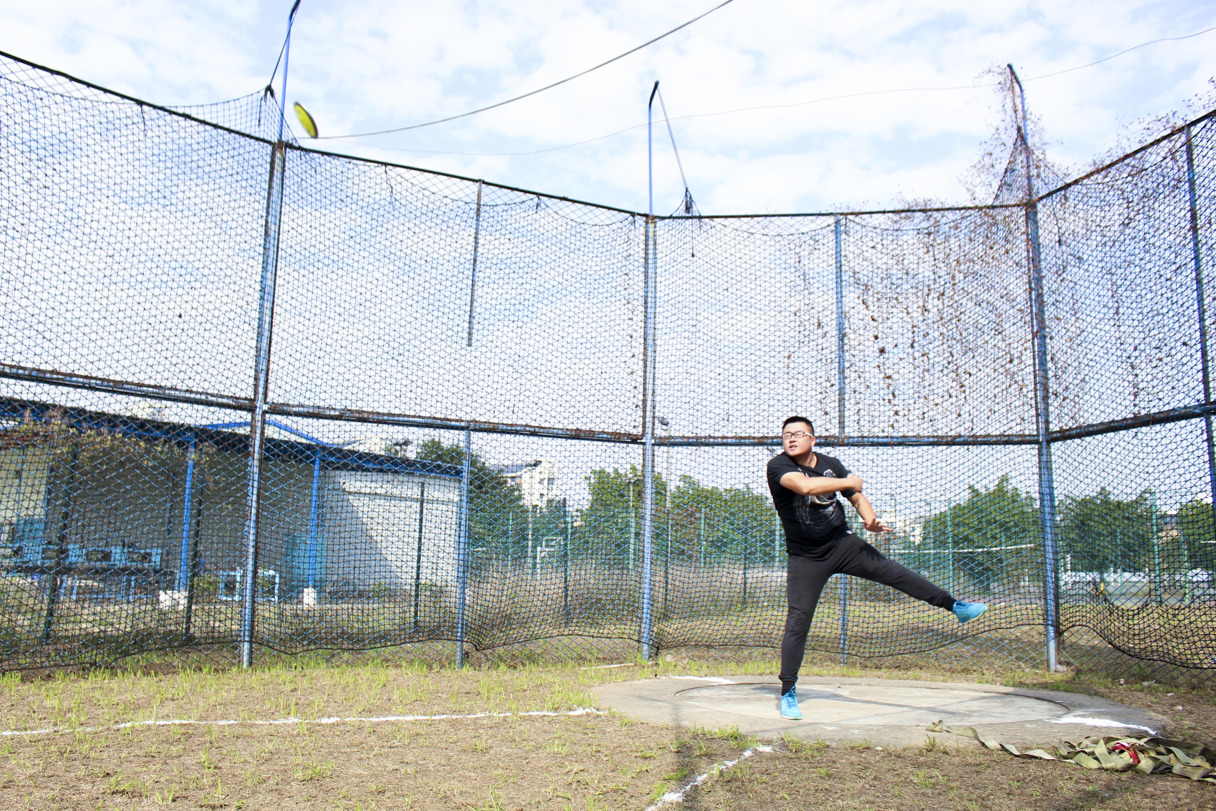 比赛开始之前,选手们在场地旁进行热身运动的练习。调整好姿势,找到最佳发力点,侧身蓄力,后引,投掷铁饼以可见的影子飞了出去,落地后发出响亮的声音。来自物信学院的施洋老师左脚点地,两脚用力,出手迅速,在第三次投掷时一举投出了26.639的好成绩,提前锁定胜局。值得一提的是,来自经管学院的巫朝辉在最后一次投掷时笑称这将是他的“青年组最后一饼”,画下了结束的帷幕。