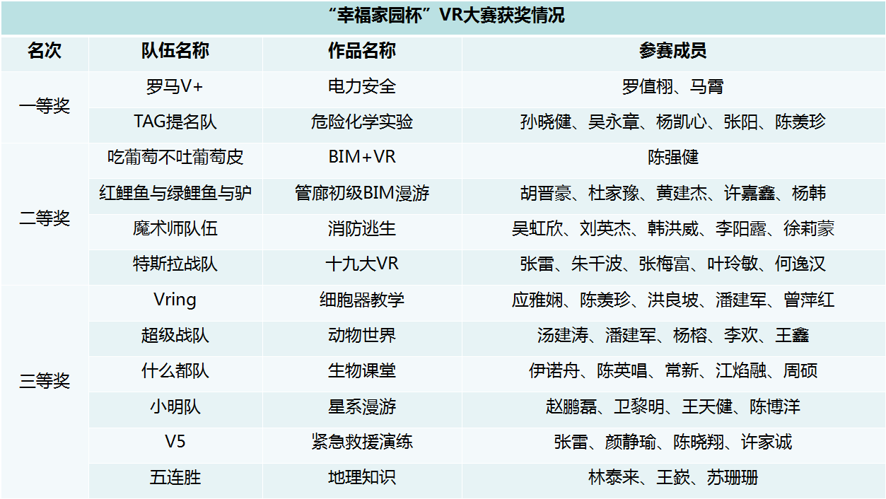 本次大赛共有12支团队参赛,经过激烈的比赛,最终由罗马V+队所制作的作品《厂房安全教育》及TAG提名队的作品《化学实验室》夺得一等奖;《十九大VR展览馆》等4支队伍制作的作品取得二等奖;《动物世界》等6支队伍制作的作品取得三等奖。