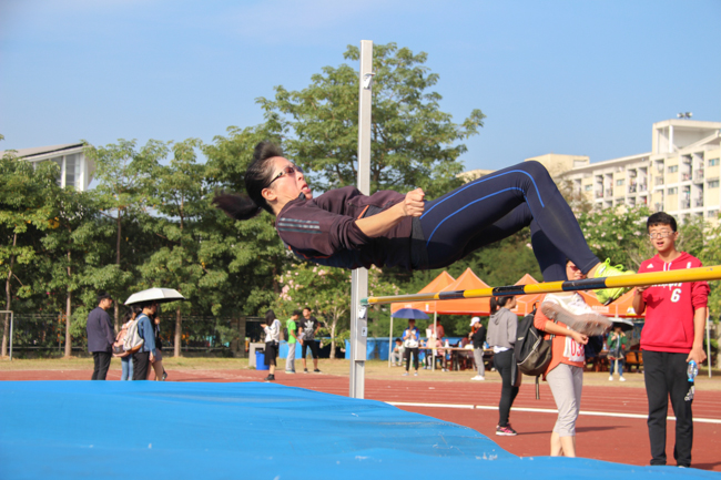 开赛在即,裁判员调整杆高至1米,参赛老师依次试跳,逐渐进入比赛状态。随着杆高不断增加,比赛难度升级,对参赛选手的考验越来越多,赛点连连。来自校直联队的李玲老师做好准备工作助跑,以跨越式成功越杆。在比赛过程中,运动员们虽偶有失误,但总体表现状态良好。来自工艺美院的朱志平老师首跳即挑战1.09米的高度,成功越过,以其出色的弹跳力一路过关斩将,最终以背越式成功越过1.25米的高度,现场观众均不住地赞叹。在比赛过程中,来自机关联队的张英玉老师不幸受伤中止比赛,在场人员及时地帮助及关心,彰显了合作关怀的运动精神实质所在。