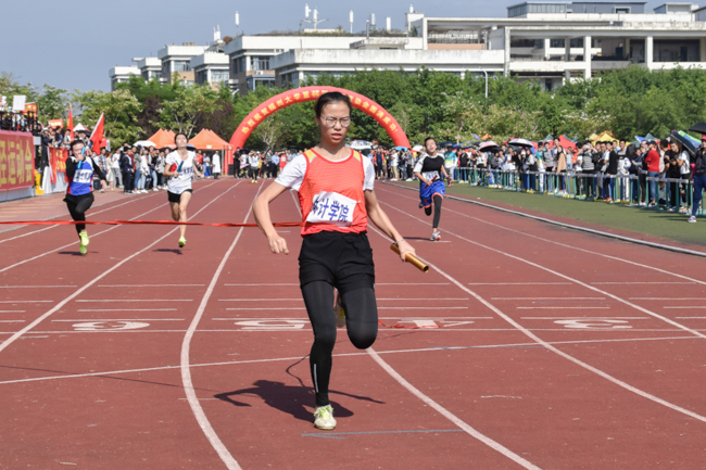 发令枪响,第一棒的运动员一齐向前奋力冲刺。在交接接力棒时,所有选手之间的传递动作干净利落。比赛分为两组进行。在第二组比赛中,经管学院的选手在第二棒时落后于其他学院,但在第三、四棒的全力冲刺下,在赛程的最后50米,经管学院的选手逐渐超过其他选手,率先冲线。