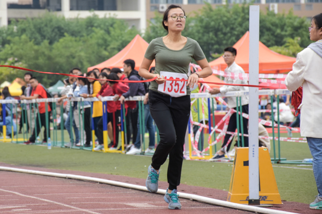 一声枪响,老师们应声冲出起点,校直联队的程文芳老师一马当先,迅速与其他选手拉开距离。第一圈结束,一匹黑马脱颖而出——化学学院的祝淑颖老师持续加速,最终超过程文芳老师,第一个冲向终点。看台上欢声擂动,观赛同学用尽全力为自己的老师呐喊加油。