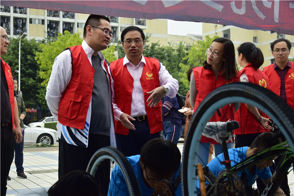 新闻中心讯/11月11日,为解决福州大学自行车修理难题,福州大学机械工程及自动化学院于福大旗山校区青春广场开展福州大学校内义务修车活动。福州大学党委副书记林生、福建省团委副书记陈训明、福州大学机械学院团委副书记刘旭莹老师莅临现场指导工作。