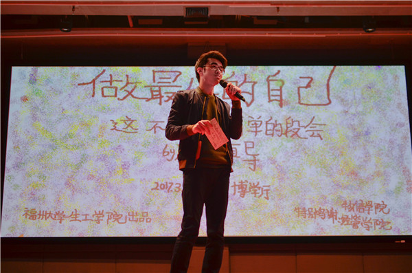 新闻中心讯/“魔王廖导也要玩转押韵兴风作浪!”3月15日晚福州大学博学厅里,举行了一场不一样的段会。来自福州大学生工学院的辅导员廖加炜在博学厅开了一次主题为“做最好的自己”的段会,有趣的是这次段会还全程网络直播,吸引近一万人次观看。