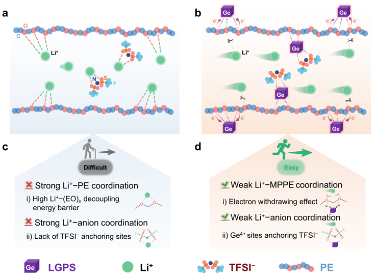 固态锂金属电池因其超高能量密度和本质安全性的优势,已成为储能领域的研究前沿。在众多研究中,聚醚类电解质(PEs)因其优异的锂盐解离能力和与锂金属的良好界面兼容性,受到了广泛关注。然而,传统PEs的关键瓶颈在于其固有的低锂离子(Li+)电导率,这主要受限于以下两个关键因素:(1)Li+与阴离子的强结合作用,显著降低自由Li+浓度;(2)Li+与聚合物链中醚氧基团的强配位作用,阻碍Li+的高效迁移。现有策略(如聚合物链设计、填料引入及阴离子固定等)难以突破Li⁺与聚合物强耦合导致的高迁移能垒问题,结构改性虽有效但受限于材料本征结构和制备工艺复杂性。相比之下,调控聚合物周围微环境作为简便可行的新路径,尚未被充分探索。