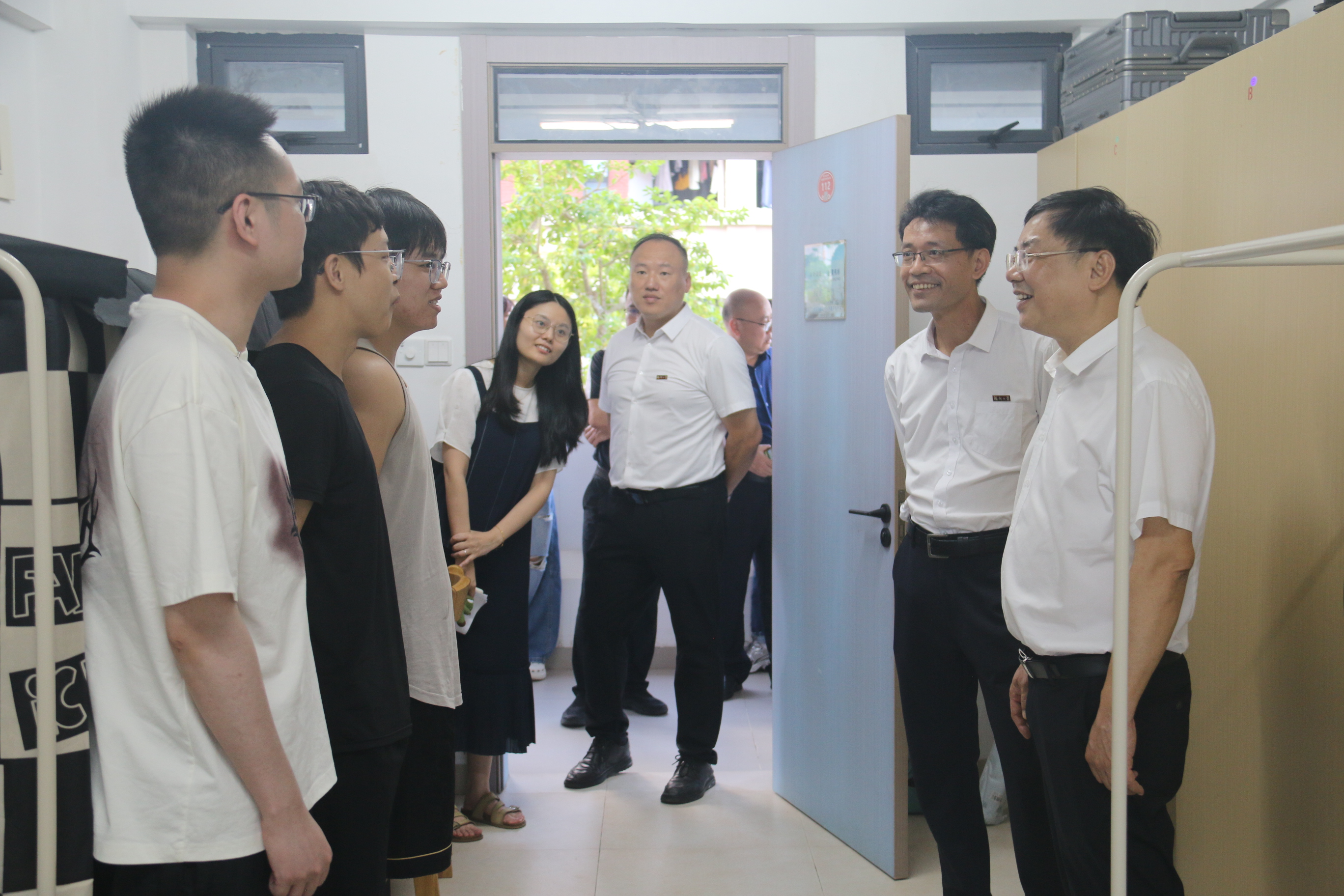 走进2025级研究生新生宿舍,林仁达主任与新生亲切交谈,关切询问住宿适应、生活物资保障等情况。当听到新生称赞“宿舍条件好,师生关怀暖”时,他鼓励新生充分利用校区科研平台与晋江产业资源,找准学术方向,推动理论与实践融合,为地方发展积蓄力量。