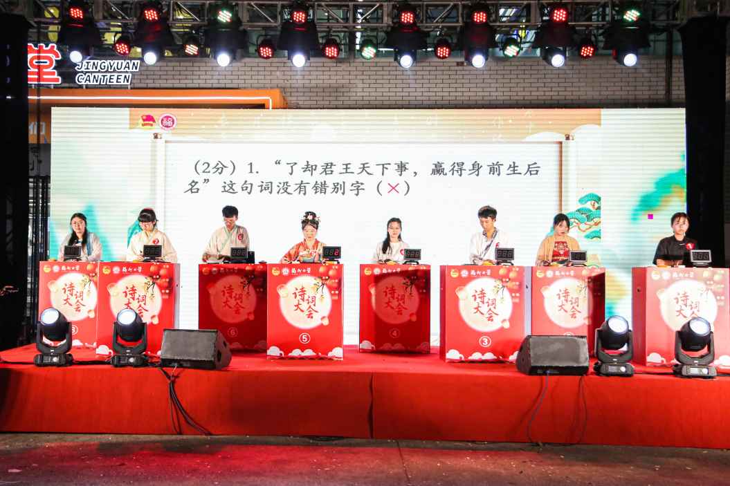 八十载烽火长歌,诗韵悠扬忆峥嵘。9月27日晚,铜盘校区生活区广场上灯火通明,一场气势恢宏的舞狮表演惊艳开场,福州大学2025年中秋诗词大会决赛正式启幕。经过前期选拔,各学院的八位决赛选手身着汉服,以诗为媒,展开激烈角逐。比赛设有积分赛、抢答赛、飞花令等多轮环节,选手们才思敏捷,妙语连珠,现场掌声不断。中场间隙,笛声悠扬,妙曲盈空,巧妙缓解了比赛的紧张感。最终,经济与管理学院的叶芊瑶同学凭借扎实的诗词功底和稳健的临场应变能力,夺得本届诗词大会冠军。夺冠后,叶芊瑶同学分享道:“很小的时候,诗词便与我相伴,通过日积月累,我对诗词世界的热爱愈发浓厚,至今仍在延续。”关于诗词的学习技巧,叶芊瑶同学表示,结合释义,反复记忆与巩固是一个不错的方法,希望更多同学能通过诗词感受中华优秀传统文化的魅力。