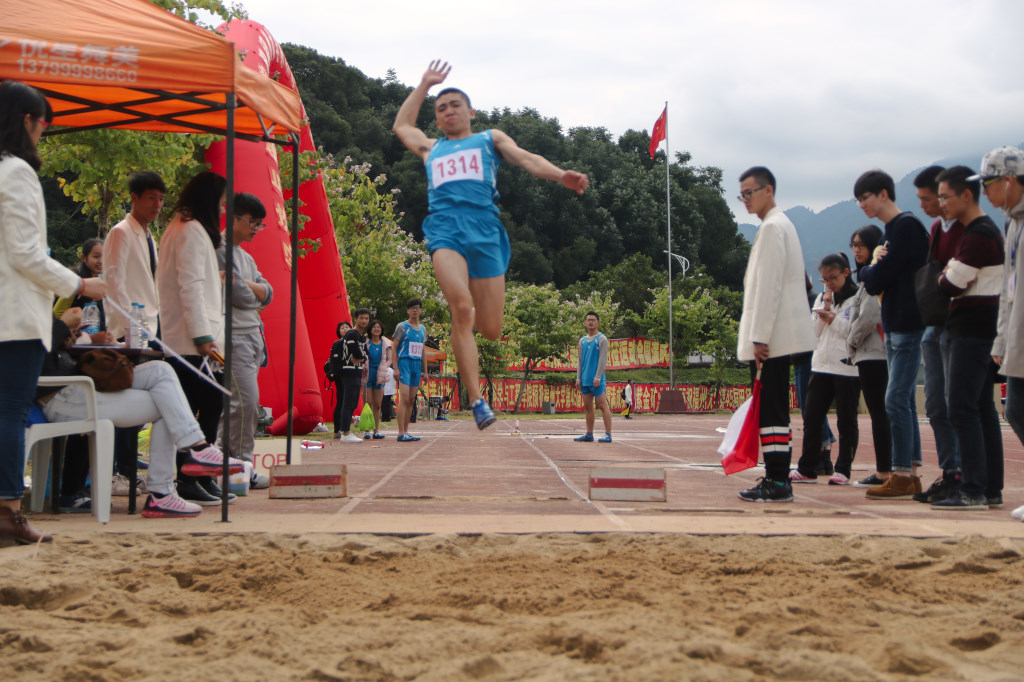 来自化学学院的三名参赛运动员身着蓝色院服,在红色跑道上一次次奔跑跳跃,成了一道亮丽的风景线。其中,来自化学学院的郭水深凭借着优异的成绩获得冠军,他一步一步丈量着步伐,在起跑线前奋力起跳,完美的抛物线后稳稳当当的落在沙坑里。值得一提的是,郭水深每一次的跳跃都超越了自己前一次的成绩,其不懈努力的精神让人佩服。