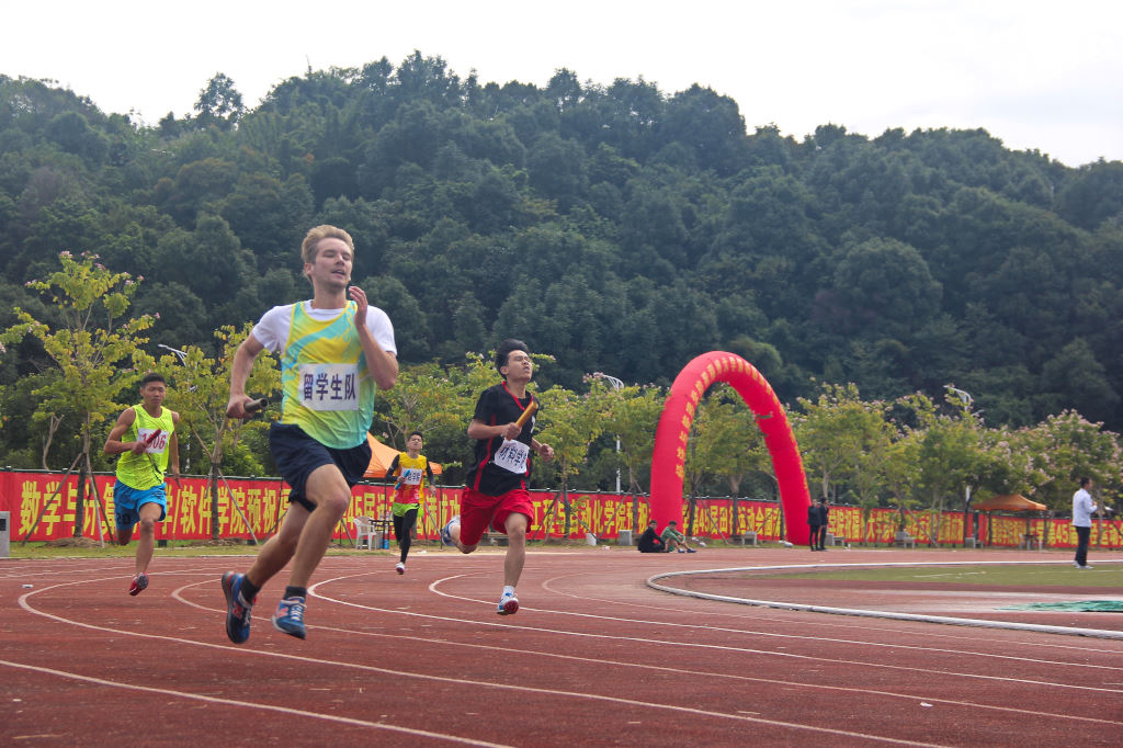 比赛分两组进行,比赛开始前选手相互给队友加油鼓励,尤其是留学生代表队的同学,向周边的同学们热情地招手微笑致意。第一棒的选手在起跑线前蓄势待发。枪声与脚步声几乎同时传入耳膜,选手们纷纷大步向前,踏下的每一步都异常坚定,伴随着为学院争光的信念与不变的誓言。在传递接力棒时,所有选手动作干净利落,仿佛沉甸甸的信念,寄托同学们的期望。