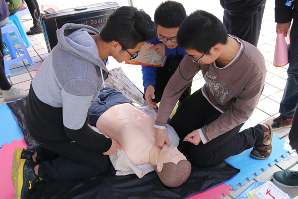 同学们在现场进行急救演练 学生记者 刘艺林 摄