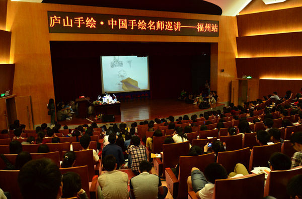 新闻中心讯/4月12日,福州大学明德厅外围贴满了手绘名画,从建筑设计到庭院景观,从动漫设计到服装设计,每一幅都吸引眼球又令人赞叹不已。下午2时许,庐山手绘•中国手绘名师巡讲——福州站于此处正式开场。巡讲现场座无虚席,吸引了来自榕城各高校的学子。