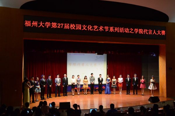 新闻中心讯/“今晚,我们都感受到了每个学院的独一无二魅力,感受到了每个代言人对学院的热爱。”4月12日晚7点,福州大学第27届校园文化艺术节系列活动之学院代言人大赛在明德厅火热展开。有来自不同学院的18位代言人参加了比赛,一展各院风采。