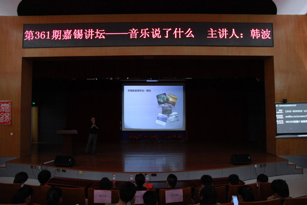 本次活动的主题为“音•情•形—音乐说了什么?”,音乐是贯穿活动的主基调。韩波老师通过三部分——“音乐常用来表达的形象及情感”,“如何用音乐来表达形象、情感”及“名家名曲赏析”进行解读。他用幽默诙谐的语句展示了他眼中的音乐,从古典音乐到流行音乐,从愉悦曲调到悲壮曲调,从音乐表现出的动物到人物。在场的同学无不深深陶醉于此,一曲《森林的日出》结束了这段奇妙的音乐之旅,而同学们依然意犹未尽。