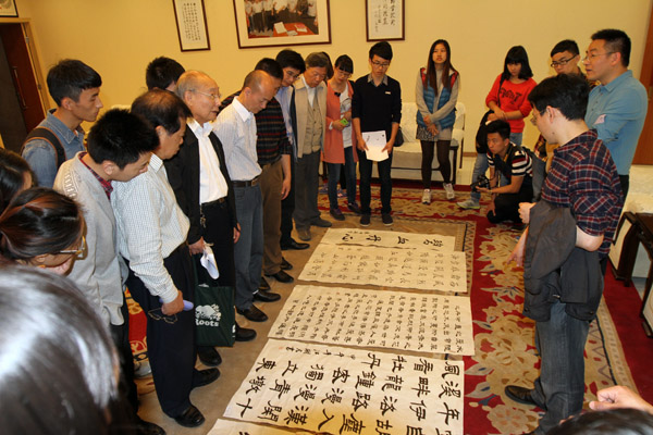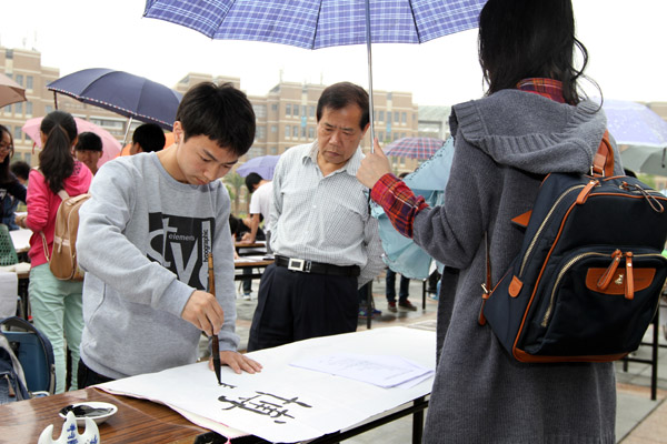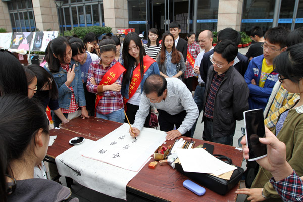 评委现场挥毫泼墨,吸引了广大同学和书法爱好者围观 记者 李连富 摄