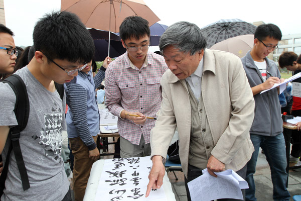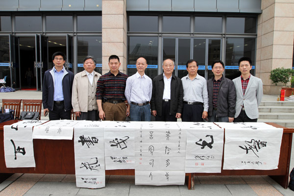 新闻中心讯/5月10日上午,由福大党委宣传部、校团委、校语委办主办,经济与管理学院承办的福州大学2014年书法大赛在旗山校区福万广场举办。中国煤矿书法家协会理事、福建书协会员张文华,中国书协会员吴德才,福建书协会员陈元春,福建书协会员、数计学院教授傅清祥,校老年艺术协会会员、材料学院教授郑逊昭应邀到场担任评委并进行现场指导和点评。党委宣传部林志凯部长、刘朝晖副部长及校团委、经济与管理学院有关负责人出席了比赛现场。这也是响应福建省语委提出的“书法家进校园”活动。