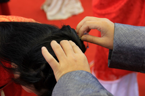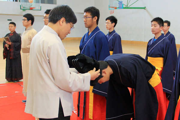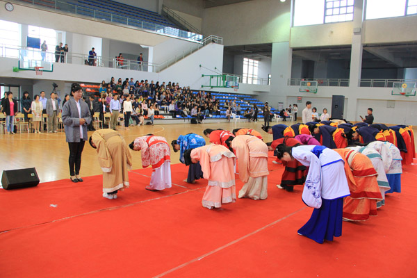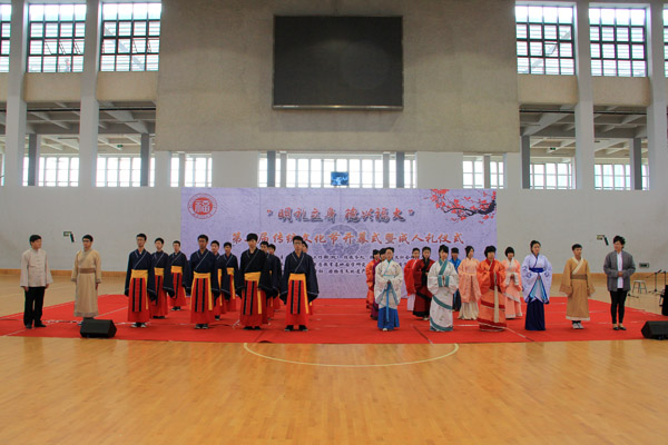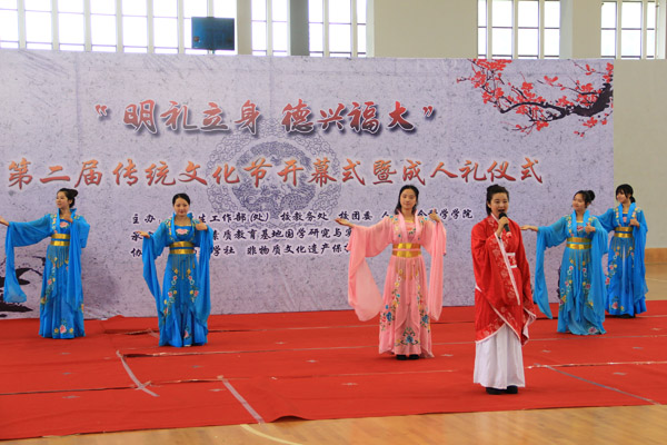 成人礼仪式是本次传统文化节开幕式的一大焦点,当天特邀福州市孔子学会孔海钦秘书长担任本次仪式的正宾,福州大学人文学院中文系副主任薛美秀老师为赞者。二十四名来自福州大学各个学院的冠笄者在两位执事的带领下,踏着典雅的乐声缓步入场。在赞礼的主持下,孔老师为冠者戴上冠,薛老师为笄者戴上发簪。最后,冠笄者向父母、师长及孔子像行三拜礼,并集体诵读宣誓。校大学生文化素质教育基地国学研究与实践中心主任梁桂芳老师作成年之训,她巧妙引用学生之间流传很广的歌曲——《不想长大》的歌词,告诫在场学子们要珍惜光阴,并以弘扬传统文化为己任,一心为学。