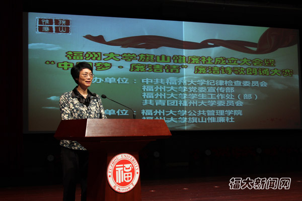 新闻中心讯/11月1日晚,福州大学旗山惟廉社成立大会在福州大学图书馆博学厅举行。福州大学党委常委、纪委邹毅书记,福建省纪委宣教室正处级副主任郑韵琴,福建省教育厅监察室刘启炎主任,福州大学纪委郑翔副书记,党委宣传部林志凯部长,监察审计处何希耕处长,学生工作部(处)程文忠处长,公共管理学院副院长、廉政建设研究所叶先宝教授,福州大学廉政建设研究所叶勇副教授,福州大学廉政建设研究所刘碧强副教授及在校师生共四百余人出席了本次成立大会。