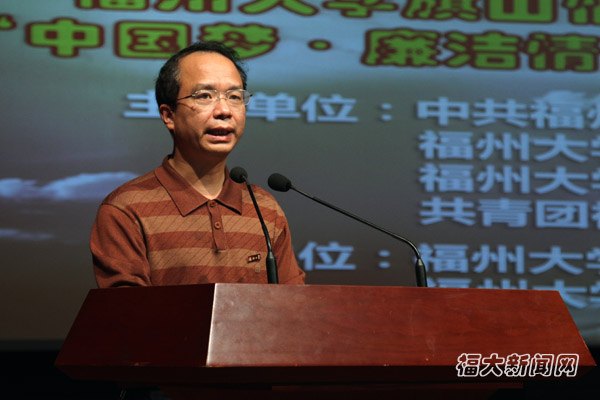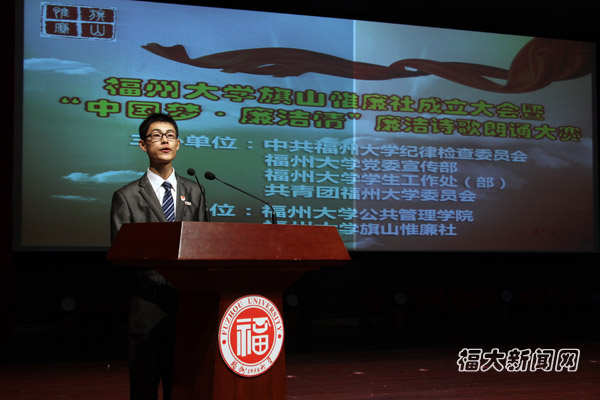作为福州大学旗山惟廉社首任社长,巫俊同学首先上台汇报了社团的筹建简况。据了解,旗山惟廉社成立是福州大学开展大学生廉洁教育的起点,也是省内第一所以廉洁为主题的学生社团,是推进廉洁文化进校园的精品活动。