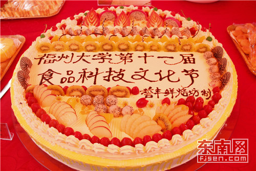 除此之外,直径长达一米的水果蛋糕更是令人惊叹连连,“福州大学第十一届食品科技文化节”的大字点缀在水果蛋糕正中央。