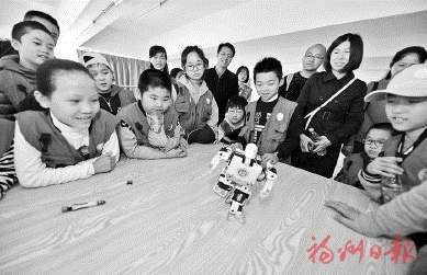 参观完地矿博物馆后,来自福州大学机器人爱好者协会的大学生们还为小记者们准备了一场机器人的视听盛宴。现场,小记者们被搬运机器人、跟踪机器人的精彩表演折服,大家兴奋地跑到机器人跟前向哥哥、姐姐们问东问西。通过活动,小记者们了解到了什么是机器人、机器人的由来、机器人技术的发展历程和工作领域等。大家表示,这次“福大之旅”让他们大饱眼福,以后还要再来参观。