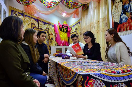 工作室充满了浓郁的民族风情:墙面上挂着哈萨克族的挂毯,炕上的长条桌铺着精致的桌毯,摆满了巴旦木、葡萄干等新疆特色干果,屋里放着冬不拉、热瓦甫等民族乐器,厅堂四角有艾德莱丝绸,关于少数民族文化的介绍随处可见。每到节日,各族学生在此弹起民族乐器,跳起欢快的舞蹈,一派其乐融融的景象。
