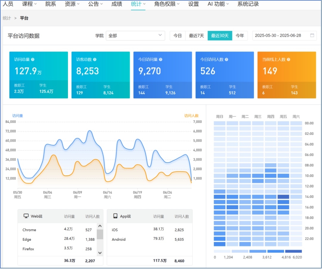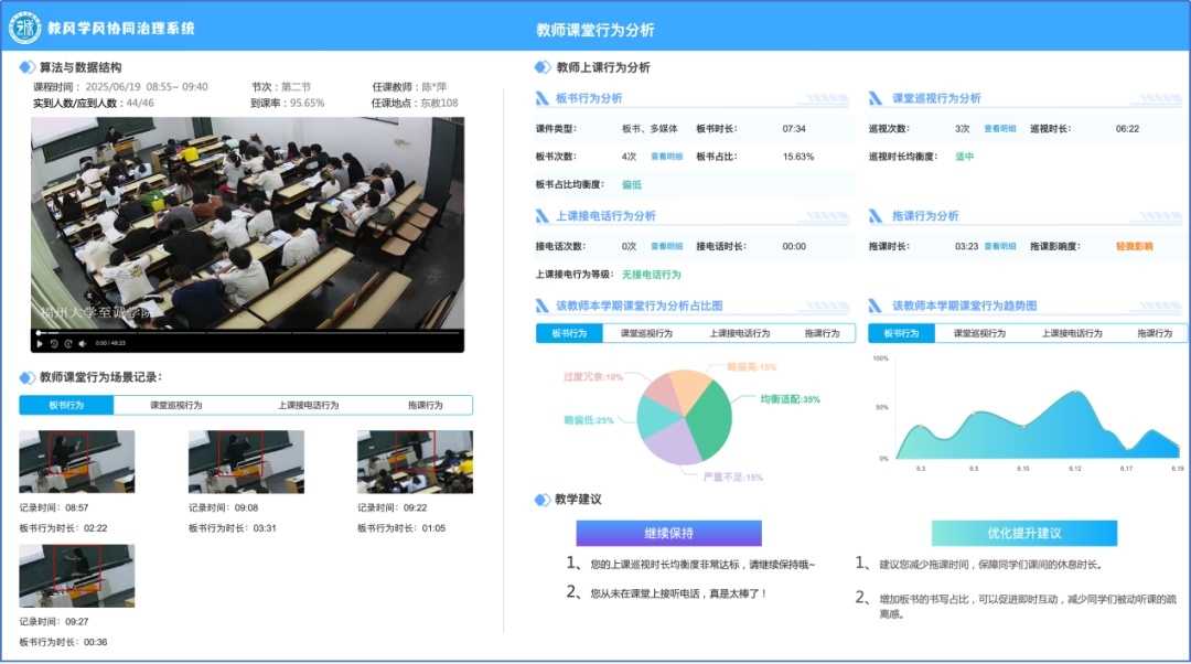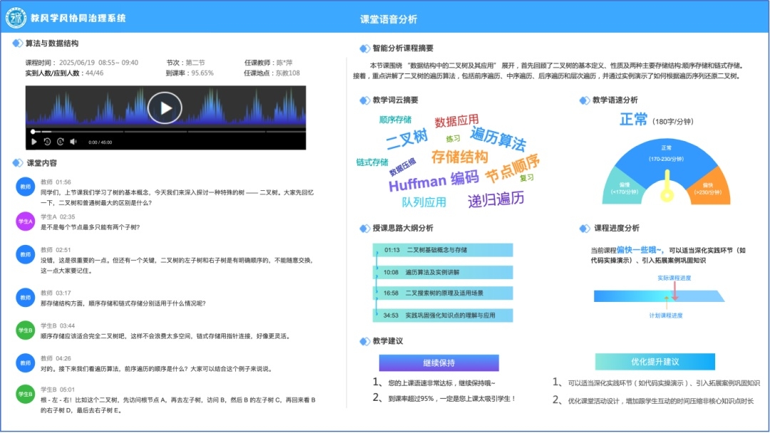 AI 技术还延伸至教学管理领域:学院开发了教风学风协同治理系统,实时查看师生的上课情况,课堂出勤率实时同步至辅导员终端,学生抬头率、前排就座率等指标实现“秒级监测-预警-处置”出现异常情况通过短信及时预警处置;通过AI课堂语音分析和课堂行为分析,将课堂情况同步给教师个人和教务管理人员,异常情况通过短信及时预警。师生可以实现温故而知新,教师通过知识盲区热力图、问题词云等工具,可精准实施因材施教。