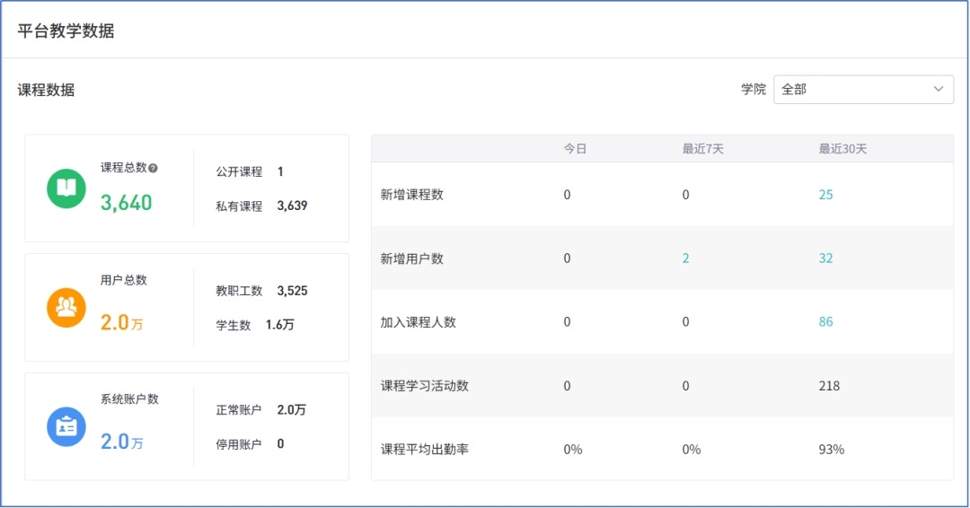 两年来,该模式大规模运用,并取得良好效果。学院开设课程超过3500门、知识库资源超100T、月均访问量超百万人次。获批教改项目10余项,学院也成为全球智能教育联盟理事单位。