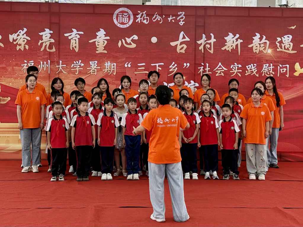 教学成果最终在“红歌嘹亮育童心·古村新韵遇青春”主题文艺汇演中精彩呈现。汇演由福州大学人文社会科学学院,永定区教育局、抚市镇人民政府主办,永定区抚市中心小学、抚市镇新民村承办。福州大学人文社会科学学院党委副书记赵燕松,抚市镇党委副书记、镇长华燕龙,以及福州大学与抚市镇各级领导干部、教师代表莅临观演。实践队彭雯琪、李金峰,抚市中心小学苏思辰、王万辰担任汇演主持人。