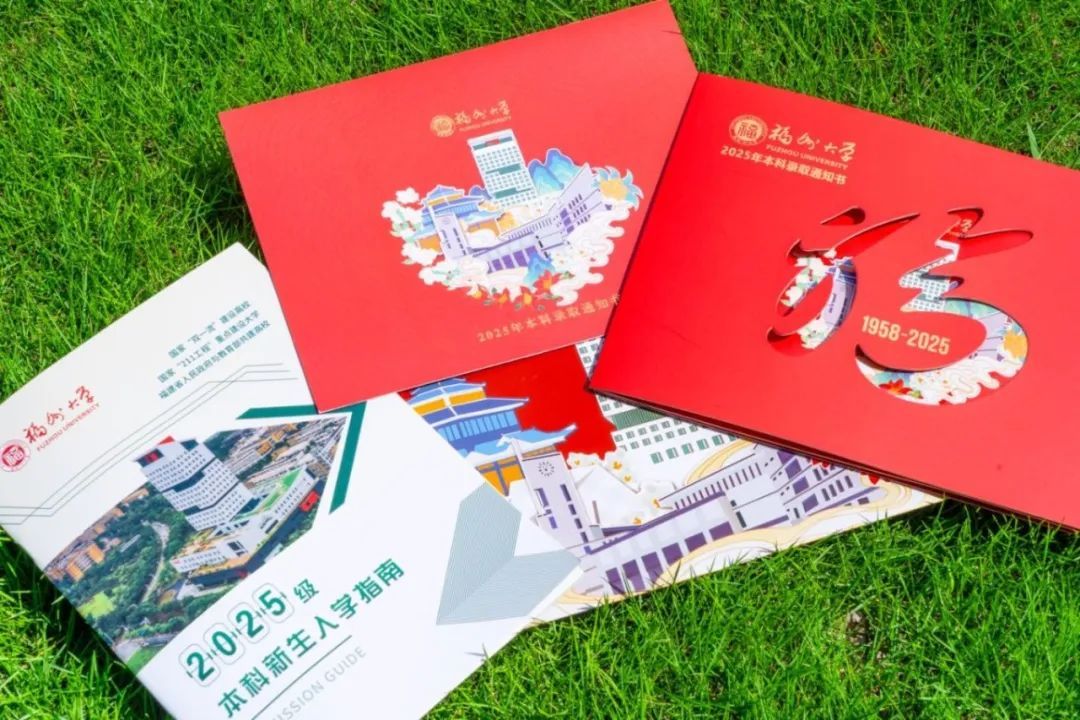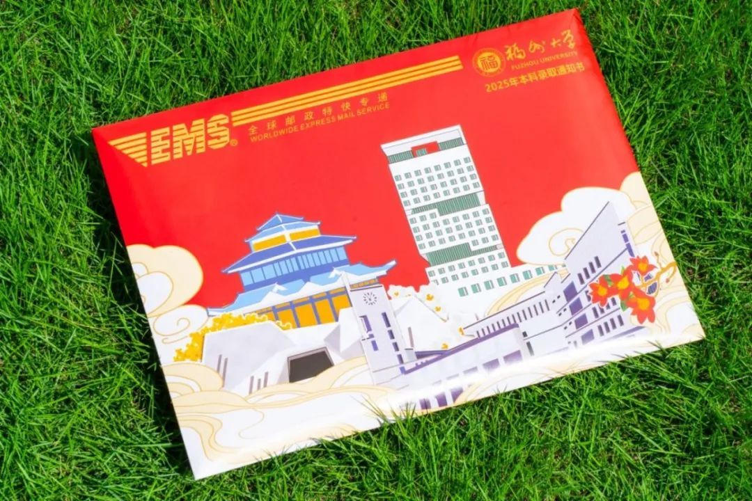 这份精美的录取通知书由福大在校学子亲手绘制设计,以“锦时芳华”为主题,以“时间轮转 福地共生”为内核,将福大红与校园标志性建筑结合,承载着福大的精神文化连接着福大人共同的情感基因。