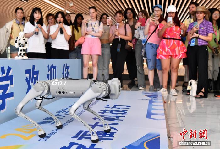 8月17日,参加第二十四届“汉语桥”世界大学生中文比赛全球决赛,来自全球100多个国家的125名选手走进福州大学参观交流。图为外国大学生在观看智能机器狗展示。中新社记者 张斌 摄