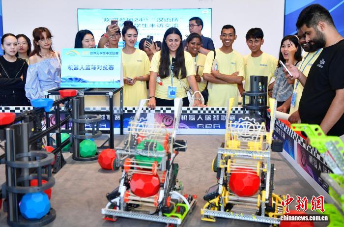 8月17日,参加第二十四届“汉语桥”世界大学生中文比赛全球决赛,来自全球100多个国家的125名选手走进福州大学参观交流。图为机器人篮球对抗赛吸引外国大学生参观体验。中新社记者 张斌 摄