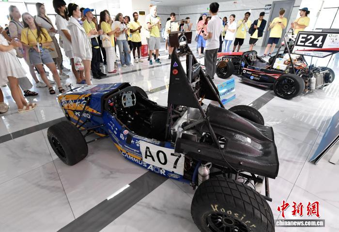 8月17日,参加第二十四届“汉语桥”世界大学生中文比赛全球决赛,来自全球100多个国家的125名选手走进福州大学参观交流。图为外国大学生在参观展示的方程式赛车。中新社记者 张斌 摄
