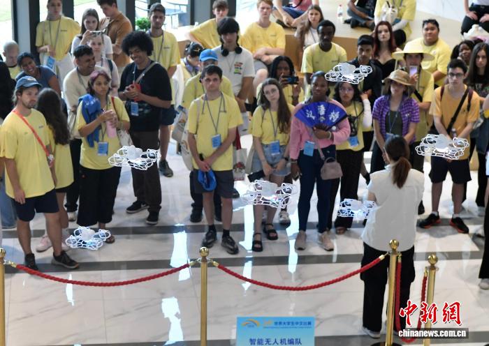 8月17日,参加第二十四届“汉语桥”世界大学生中文比赛全球决赛,来自全球100多个国家的125名选手走进福州大学参观交流。图为外国大学生在观看智能无人机编队展示。中新社记者 张斌 摄