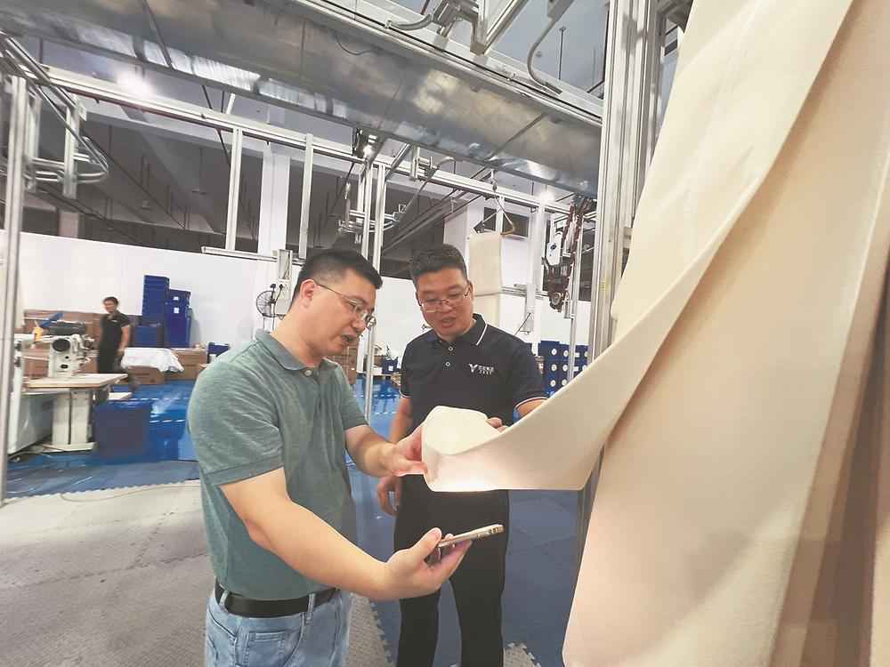 清源创新实验室在企业常驻科研人员王巍博士(左)与远致集团生产总监刘忠良(右)讨论P32纤维滤袋成品制作细节。本报记者 李珂 摄